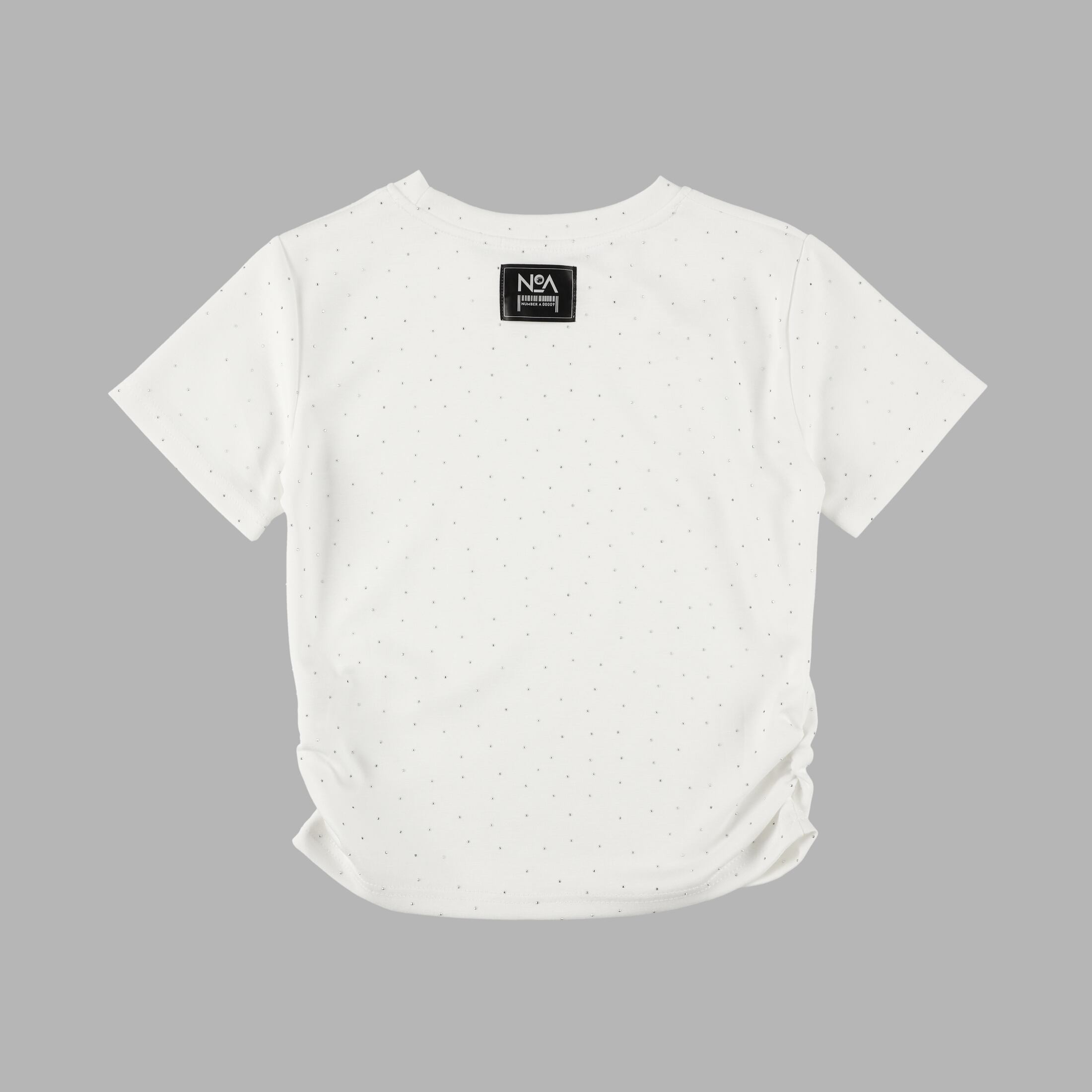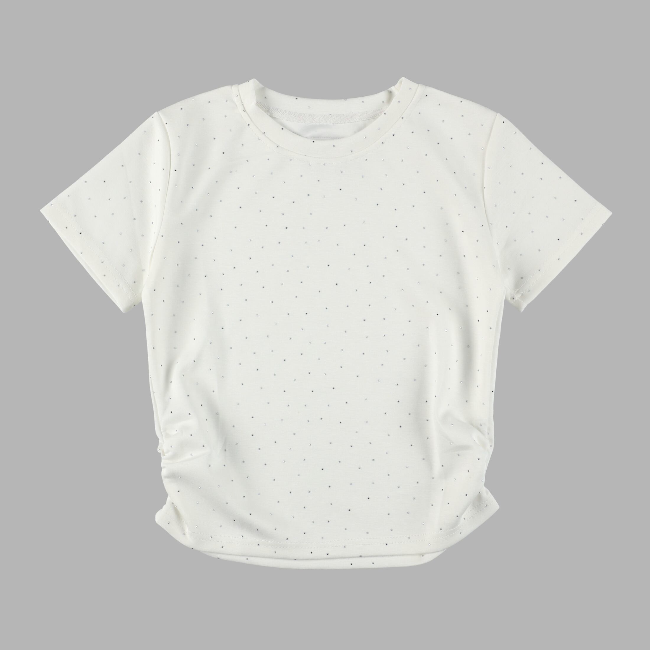 ほどよいショート丈のトップスにはサイドギャザーを施し、少しアクセントを加えました。